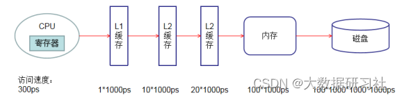 可以看出寄存器访问数据的速度,是内存的300倍,是磁盘的30000 万倍。
