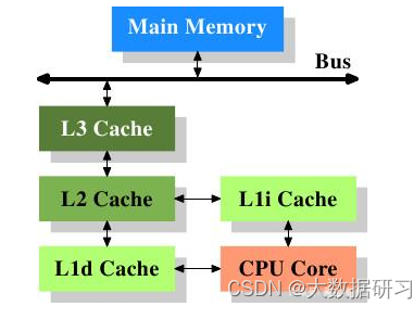 典型计算机的存储层次结构如下图所示,存储媒介距离CPU越近,则访问数据的速度越快。
