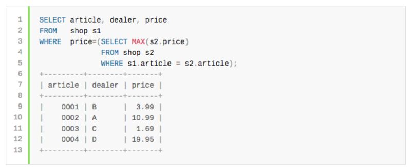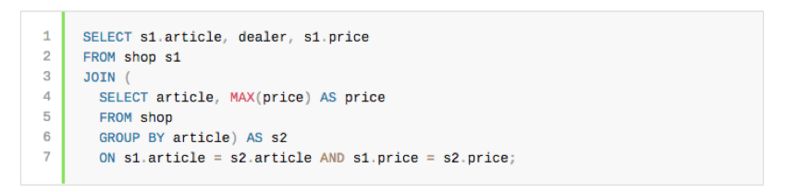 这张表有三列,article、dealer、price。它做的事情是从这个表里选取每个作者最贵的商品列在结果集中,这是它最原始的 SQL,非常符合业务的写法,但是它是个关联子查询。