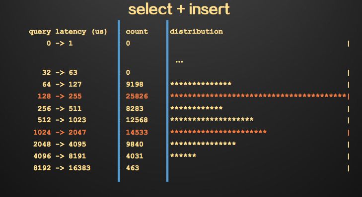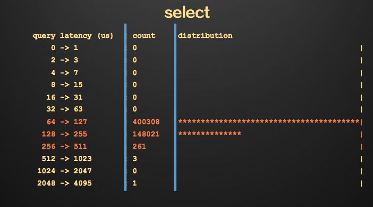对于这台服务器来说,我下了一个 select 的性能压力,它大部分的请求集中于 64 到 127 微秒之间。这个数据库的性能可能还不错。