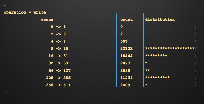 这个命令的结果分为三列,它的第一列是请求的延迟,指数级递增,单位是微秒,中间一列是它的命中数,如果有一个请求命中了 64-127 微秒这个区间,命中数会加一,最后一列是它的分布图,它在同一个报告里提供了数值的方式和图的方式,可以很容易看到结果。