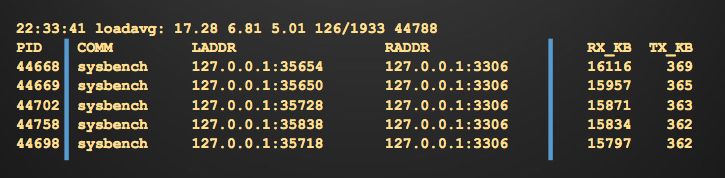 这个例子中, sysbench 上了一个大并发,但是只活了 300 多毫秒,这些连接都只活了 300 多毫秒,反复运行这个 sysbench 就可以将数据库打死,建立一千个连接,300 毫秒以后也会销毁,再建立一千个连接,你的业务就会忽上忽下,通过这个脚本就可以抓到这个压力从哪个服务器来的,哪个端口来的,然后把它搞定就可以了。