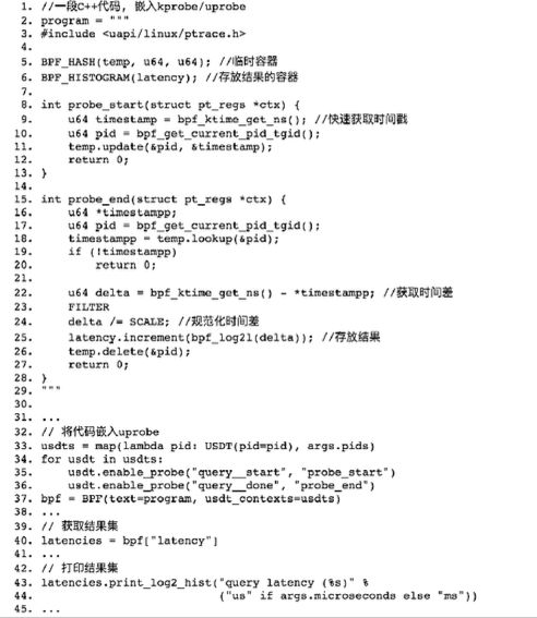 拿上面提到过的 MySQL 延迟分析举例,一个 MySQL 上面有一千个 query,这些 query 大概都落在哪个延迟时间里面那张图,为了完成这个需求, 我需要写两段程序,其中第一段程序是运行在内核里边的程序。