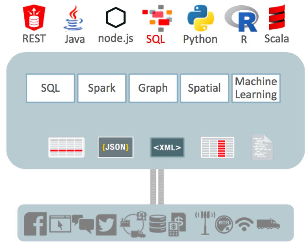 再看一下逻辑层,这是大数据现有的分析平台,任何的语言都可以来读取数据库,也可以进行任何的分析。无论是 SQL、Spark 或者是 Graph 或机器学习,这种数据的结构也可以变,有结构的、无结构的,或者是 JSON 的,亦或是其他类型的数据库,比如关系型、非关系型等等都是可以的,数据可以来自于任何的数据源,这就是一种新的大数据分析模式。