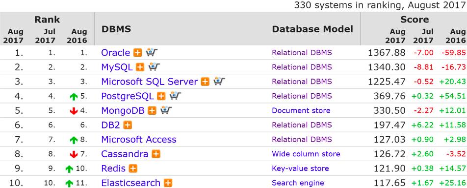 根据 DB-engines 网站的最新统计,不难发现,当把开源数据库 MySQL 和 PostgreSQL 加在一起,开源数据库就已经超越了商业数据库 Oracle,成为世界上最流行的关系型数据库。
