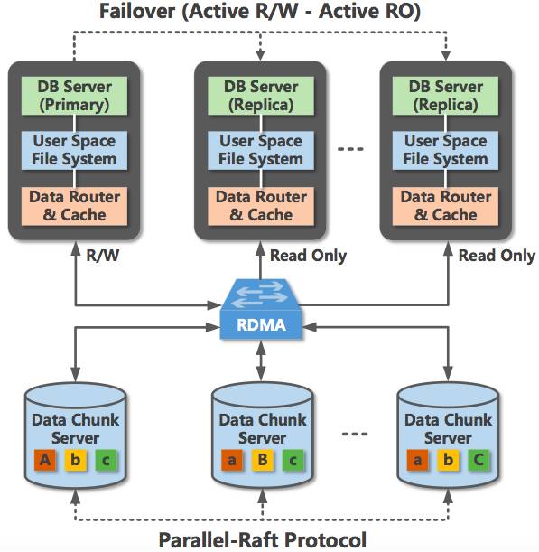 同时 DB Server 之间仅需同步 Redo log 相关的元数据信息。Chunk Server 的数据采用多副本确保数据的可靠性,并通过 Parallel-Raft 协议保证数据的一致性。
