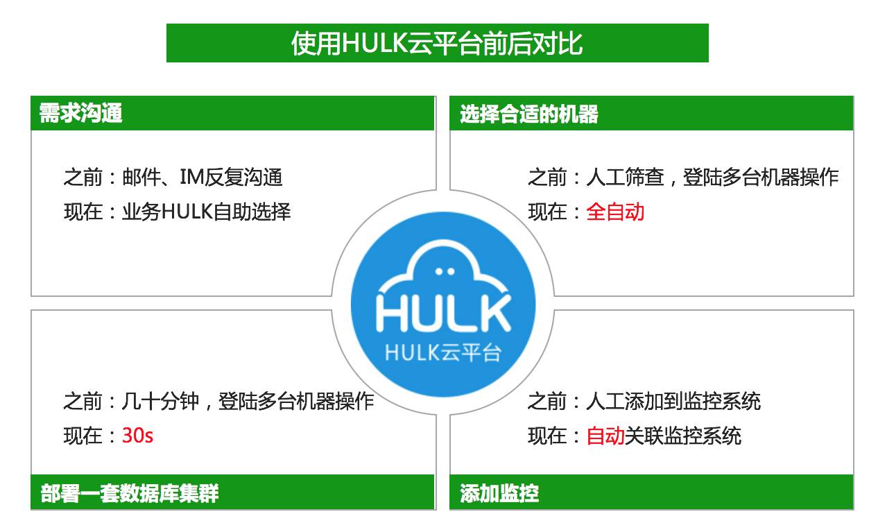 不知道大家跟业务或者 DBA 沟通需求通过什么途径,当年我们没有搞自动化之前,需求沟通占用很大一部分工作时间,并且资源管理、服务部署等都是体力活,往往业务从需求沟通到实例部署完成,都是小时计的,而现在,我们可以做到分钟级,下面是在使用 HULK 平台自动化前后的对比。