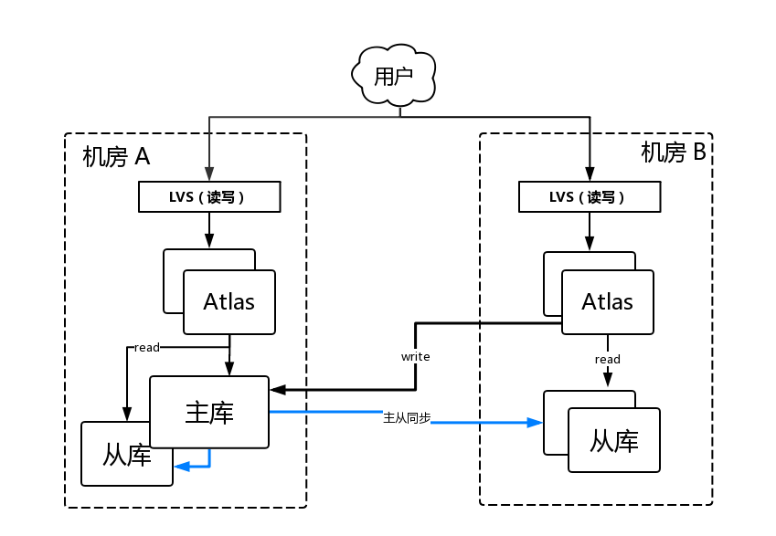 实例创建完成,下图是我们默认的数据库架构图,以双 IDC 为例,用 Atlas 作为中间层,提供读写分离,Atlas 已经开源具体可以参考:https://github.com/Qihoo360/Atlas 。 在 Atlas 之上用 LVS 做了一次隔离和负载均衡,其中为了高可用,每个机房的服务节点都是部署多个,避免单点故障。