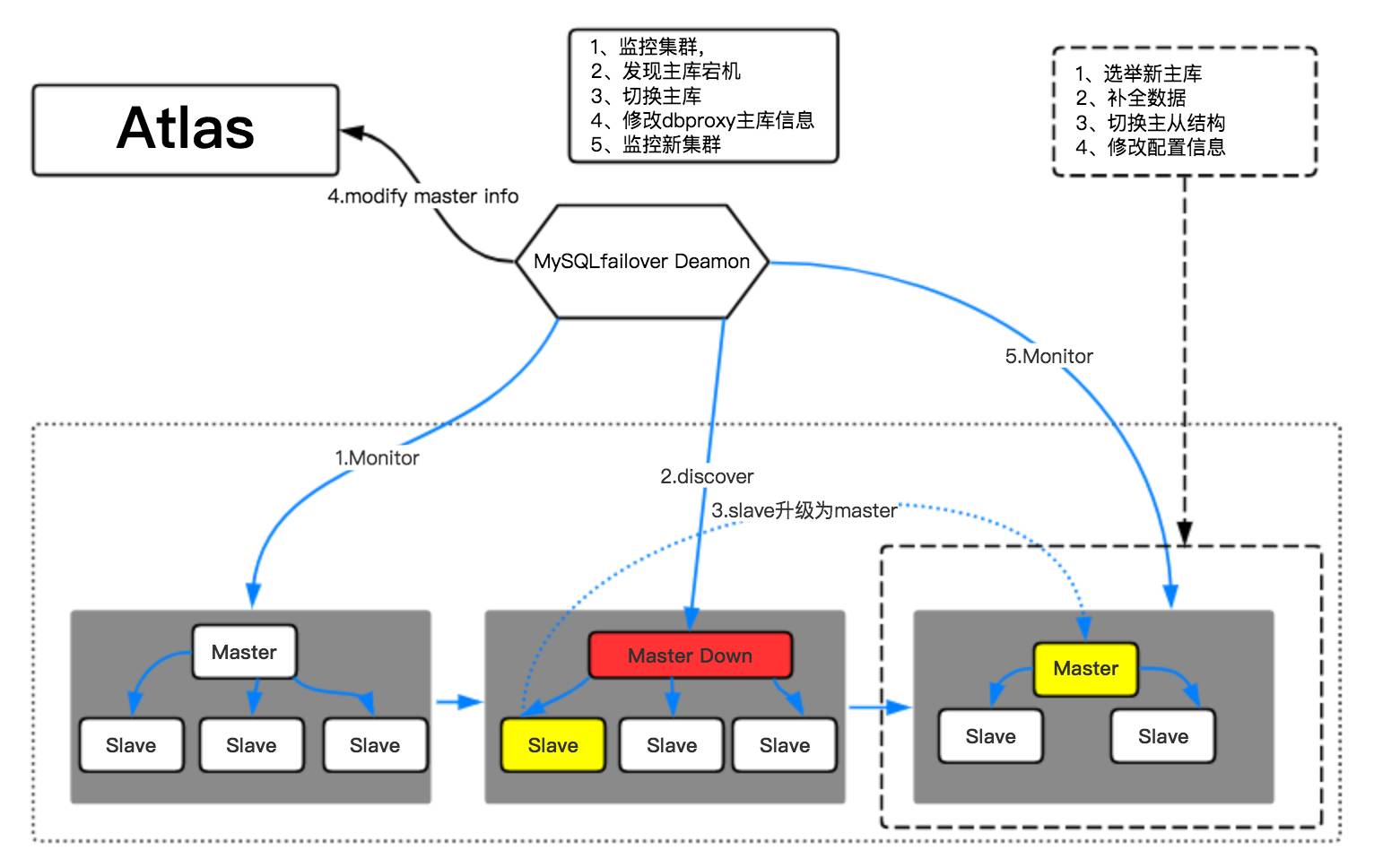 当单个 Atlas 故障的时候,LVS 检测到异常会直接下线,而当单个从库故障的时候,Atlas 检测到也会下线。 这样在 Atlas 和从库单点故障的时候整个集群还能正常工作,并且不影响业务使用。但是,当主库挂掉的时候,就改我们的故障自动切换 Failover 出场了。