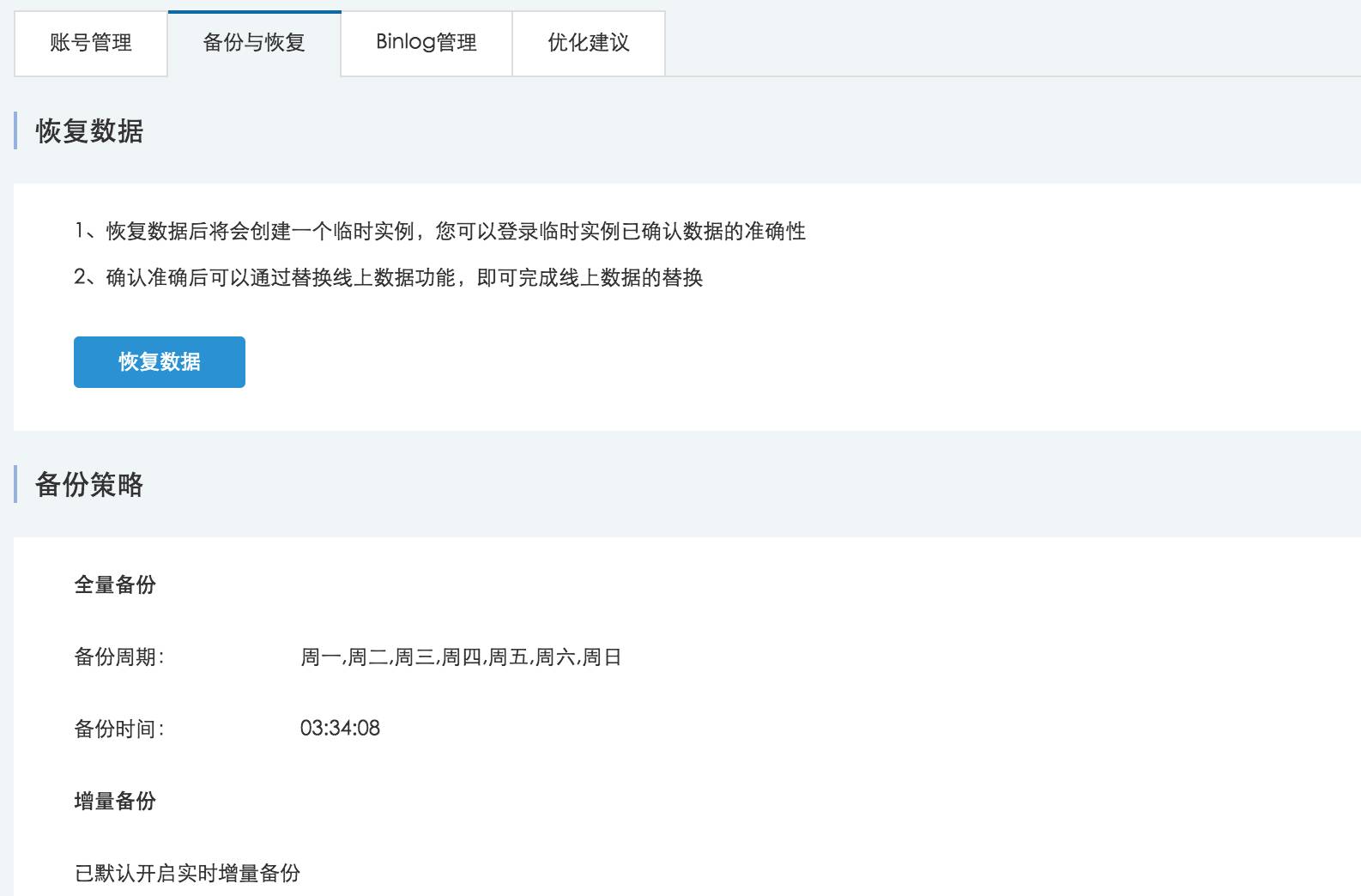 全量备份 + 增量备份(binlog),每天都会进行全量备份,同时实时进行 binlog 备份。