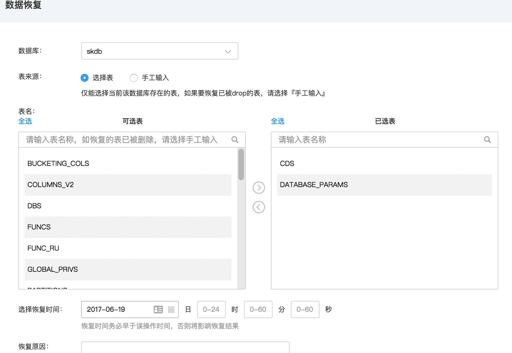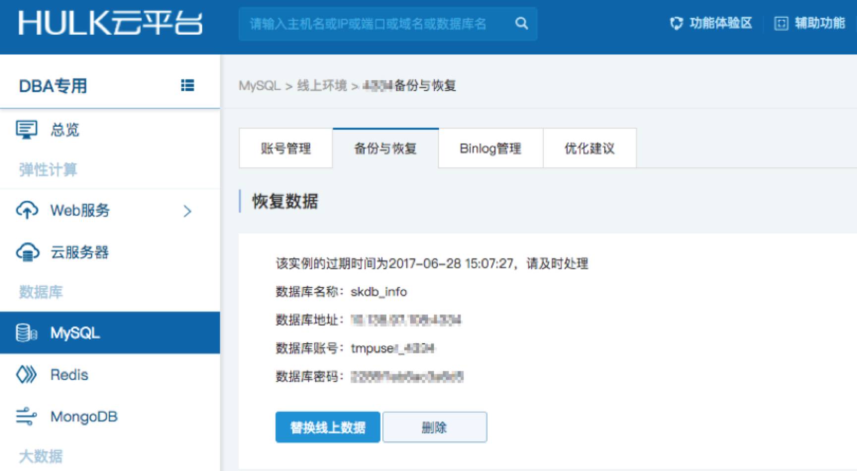 业务之需选择需要恢复的库表,选择时间提交任务即可,视数据量大小耗费时间不一,普通的几 G 的数据表,一般分钟级就能恢复,恢复后会生成临时实例,业务去临时实例确认数据无误后就可以一键替换线上,完成数据恢复申请。
