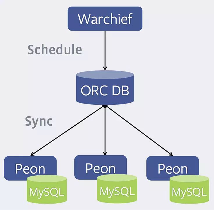 Peon - 负责还原操作的工作进程。Peon也使用Python编写,可暴露出Thrift接口,通过该接口接收有关Peon的各类状态信息。每个Peon会定期与ORC DB进行同步,查询分配给自己的新作业,并汇报自己的健康度状态。运行Peon的服务器上还运行了一个本地MySQL实例,备份将还原至该实例中。