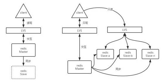 通常在一个 Redis 实例能轻松应对的场景下我们会使用 1 主 1 从结构,主库通过 LVS 把自己“藏起来”,而从库是纯粹的容灾功能并不提供任何服务,所以对用户是透明的,这种情况下的主库宕机灾难太好解决了:将从库升级为主库,再用这个新的主库替换掉 LVS 下的故障主库即可完成整个容灾过程,LVS 做 rs 的切换是很快的,正常整个主库切换过程不会超过 1 分钟。而对于一些压力很大的场景,我们常见的做法是读写分离(图 2),为主库挂载多个从库,主库在 LVS 后承载写入请求,而读取请求则由另一个 LVS 后端的多个从库共同支撑。在该结构中主库挂了又该怎么办呢?