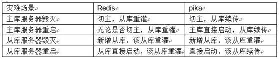 pika 的故障处理和 Redis 有相同的地方也有不同的地方,在这里分几个场景,我做了一个简单的表格来进行对比: