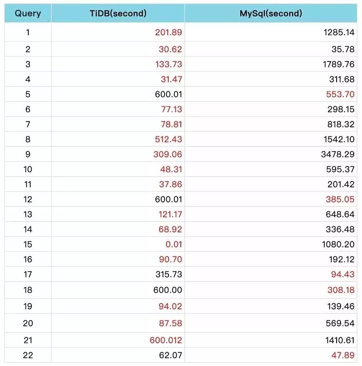 2. OLAP 测试:50G TPC-H 测试,TiDB 相较 MySQL 有很大的速度优势: