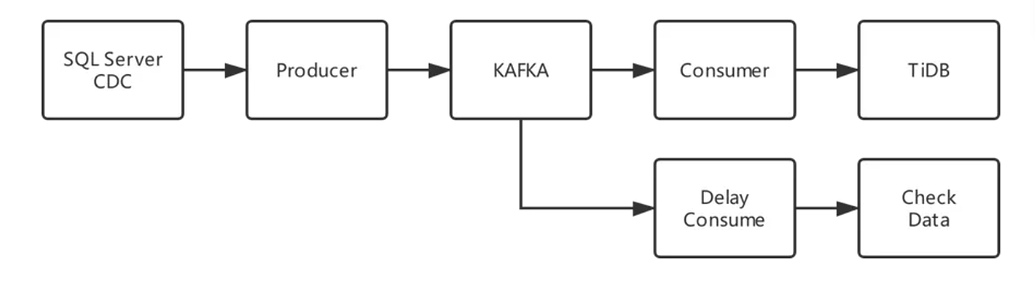 根据以上的流程图可以看到,Producer 从 SQL Server 中读取 CDC 日志,并将其转化成一条包含表信息、列信息和行数据的消息,投递到 Kafka 中。下游的消费者在拉取到消息之后,把数据转化成兼容 MySQL 的 SQL 语句在 TiDB 中执行(这里也实现了合库合表),从而实现整个数据增量同步的过程。