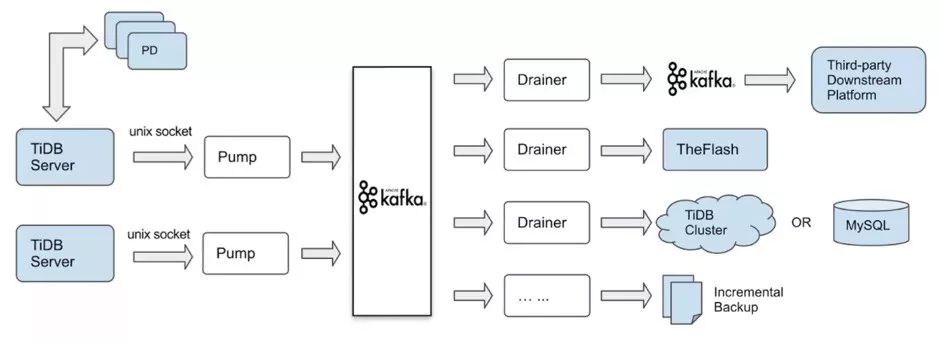 TiDB Binlog 使得这件事情轻而易举。我们使用官方提供的 Pump 和 Drainer 将 Binlog 抽取到 Kafka 之中,解析数据变更的内容,根据业务 ID 计算出数据在 SQL Server 中原本属于哪个库哪个表,然后进行数据同步。
