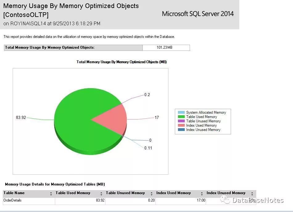 这个报表显示表的行和索引所使用的空间,以及少量由系统使用的空间。请记住,一旦创建了哈希索引,这些索引就会拥有分配给已声明的哈希桶数量的内存,因此这个报表将显示在插入任何行之前,这些索引的内存使用情况。对于非聚集索引,在添加行之前不会分配内存,并且内存需求将依赖于索引键的大小和行的数量。