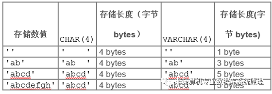 CHAR是定长字符串,存储的时候会用空格进行填充,相应的在检索的时候会自动去掉空格。VARCHAR存储的时候不会填充。- VARCHAR值存储的时候是 前缀+数据,前缀为1字节或2字节,如果值不超过255个字节,那么前缀的长度是1字节,如果长度超过255个字节,那么前缀的长度就是2个字节。在表2的第四行中,用VARCHAR(4)对’abcd’进行存储,因为值不超过255字节,所以前缀的长度为1字节,又因为数据’abcd’的长度为4字节,所以总的存储长度为4字节+1字节=5 字节。