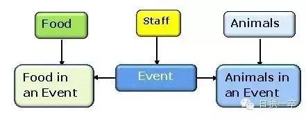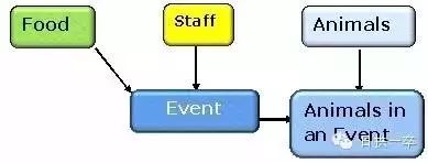 有了上面的实体,现在我们重新审视我们的数据模型,发现在饲养事件中饲养员可能饲养的动物会不止一种,所以可以把正在被喂养的动物提出来独立成一个实体,其它任何动物都有可能担当被饲养这一角色,这样一来动物这一实体就被下放到下一层级了,如下图: