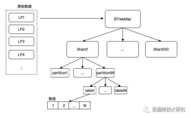 数据接收到之后就会转换为一个ParsedLine结构,根据输入的数据库名、表名、时间及数据,预先对数据进行shard及partition的分配,使用一个多级的BtreeMap结构进行存储。如图:
