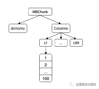 到了MbChunk之后,做了一次字典压缩,把field、tag等等的字符串都转为了id,然后使用列式存储,一列一列的存储下来。如图: