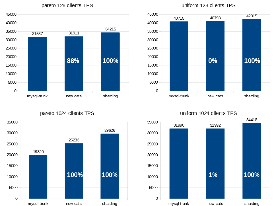 这是使用功能强大的dim_STAT工具获取的更细粒度的Pareto分布图,它显示了更改的影响(左=未修改的基准中继线,中=新CATS算法,右=在新CATS顶部锁定Sys分片)各种互斥量(上部)的拥塞以及当我们以指数方式改变连接数时,它如何转换为TPS:1、2、4、8、16、32、64、128、256、512、1024。