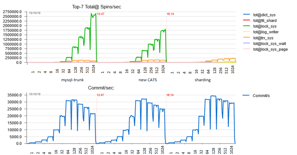 您可以看到新的CATS算法已经降低了lock_sys-> mutex的拥塞,并且新的分片彻底消除了互斥锁,将其替换为许多lock_sys_page互斥锁分片(在图表中不易看到总拥塞)和许多分片。的lock_sys_table互斥对象,甚至没有进入前7名。您还可以看到TPS下降到128个以上,以及消除lock_sys- > mutex如何使下降变得不那么引人注目,这使我们有了终极武器来战斗:trx_sys- > mutex。让我向您保证,这场战斗也一定会赢。
