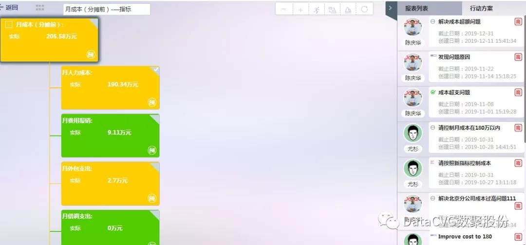 第二,可以点击图标打开数聚酒窝®里的行动方案功能,建立任务下发给相关同事进行执行,并且通过行动方案的高度互动功能对整个执行过程进行实时监控跟踪和分享,直到任务精准完成。而整体的执行过程都能保留在知识库里,未来组织内其他部门和团队遇到类似问题的时候,系统能智能检测并推送已经采用过的成功方法给他们使用,从而实现了管理效率的提高以及管理体系的良好传承。