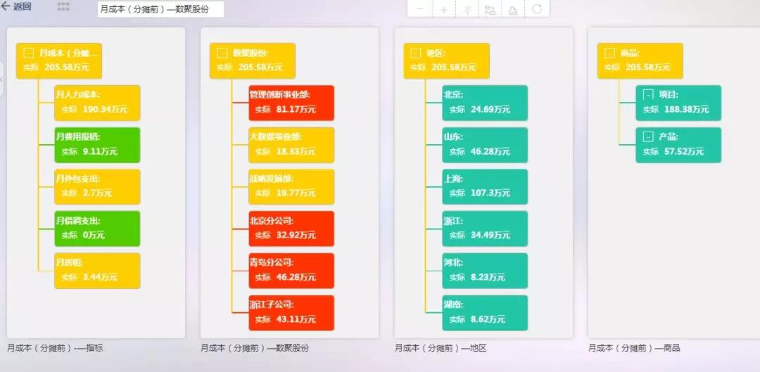 基于智能化主数据和元数据管理打通企业各个信息系统数据孤岛是数聚酒窝的基础功能,这里暂且不详细介绍。在前端业务应用层面,数聚酒窝®的一个核心功能 – 经营看板,是基于平衡计分卡KPI看板的数字化载体,让使用者登陆后能立即查看到自己最关心的核心经营指标KPI的实时数据,并以预警色显示各个数据的健康状况。看板上的核心指标可以根据需要自由设置并自适应屏幕。点击任何一个核心指标就能展开关联到这个指标的下级指标的指标树,使用者可以层层下钻定位到产生问题的指标所在。而指标树能以多种维度呈现,比如根据地区,产品线,品牌,部门等维度展现,并允许使用者选择一屏多树的对比方式查看指标树。