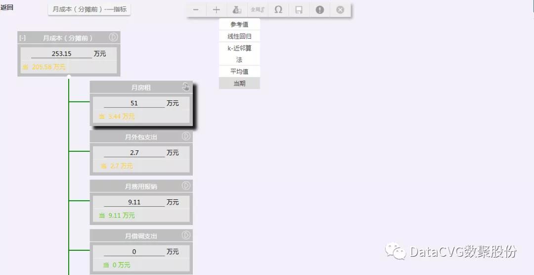 沙盘推演是基于指标树结构,让使用者可以设置公式来制定指标间的计算逻辑关系,然后选择需要进行因果计算还是果因计算,或者双向因果/果因计算,最后选择算法模型比如K近邻算法,回归算法,平均值等。这些设置完成以后,使用者根据需要可以改变指标树上的指标数值,让系统基于历史数据计算其他指标数值的联动变化。