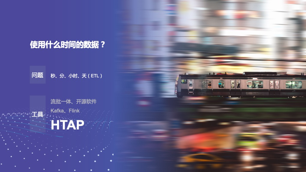 今年一篇论文《我的HTAP系统有多好?》,谈到的第一个技术指标就是Freshness(新鲜度)。就你在消费什么时间的数据?用什么样的一个方式?如果基于传统BI架构的话,我们需要从Oracle、MySQL这些交易型的生产系统里把数据同步出来,用ETL的方式或者是批处理的方式加工到数据仓库里头。所以在数据仓库里,待分析的原材料已经是以天为时间的信息了。