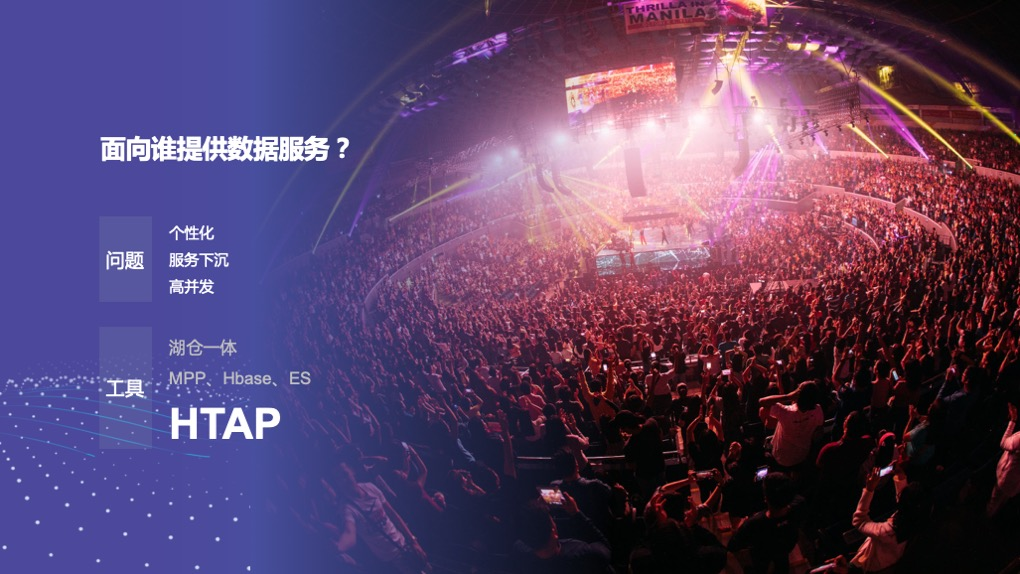 我们以前在数据消费的时候更多的都是在数据仓库里完成。数据仓库是OLAP分析型业务,通过侵占更多的资源来完成一个大IO操作。所以MPP数据库有一个很大的挑战就是它不能够支持高并发,它的作业是排队机制。当遇到个性化服务下沉时,它就碰到了一个瓶颈。