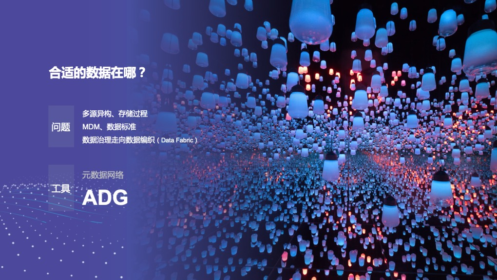 去年Delta2.0、Gartner均提出了Data Fabric,这是一个全新的数据组织结构,也是自下而上通过对IT信息化系统还原进而对存储过程、SQL语句的还原。数据编织把IT反馈的数据依赖逻辑用一个更高维的数据结构表达,就是知识图谱、复杂网络,通过把字段和库、表之间的关系,还有主键外链的这种业务逻辑,表达到一个点和边高维的可计算的元数据网络里头,通过元数据网络的计算来承担。因此新兴的方式开始从传统的数据治理走向了Data Fabric数据编织。