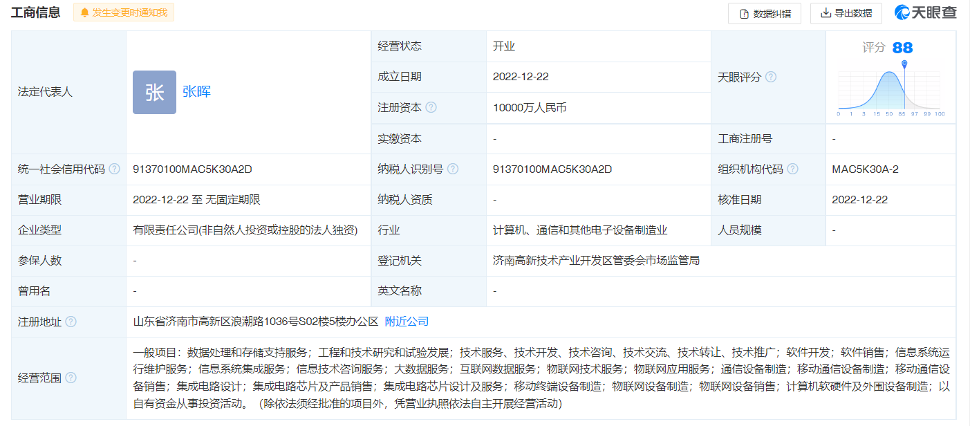 天眼查App显示,该公司经营范围含数据处理和存储支持服务;工程和技术研究和试验发展;集成电路芯片设计及服务等。