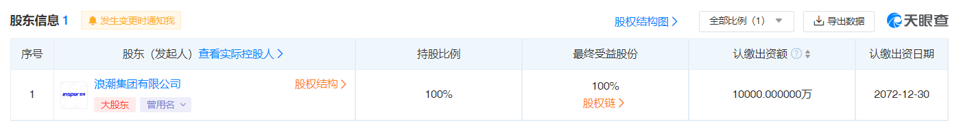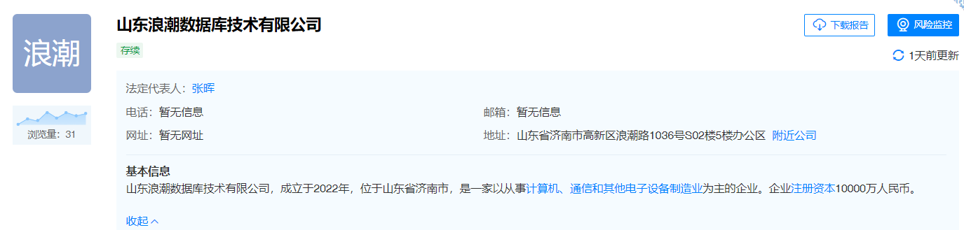 2022年12月22日,山东浪潮数据库技术有限公司在济南成立,注册资本1亿元,法定代表人张晖,由浪潮集团有限公司全资持股。