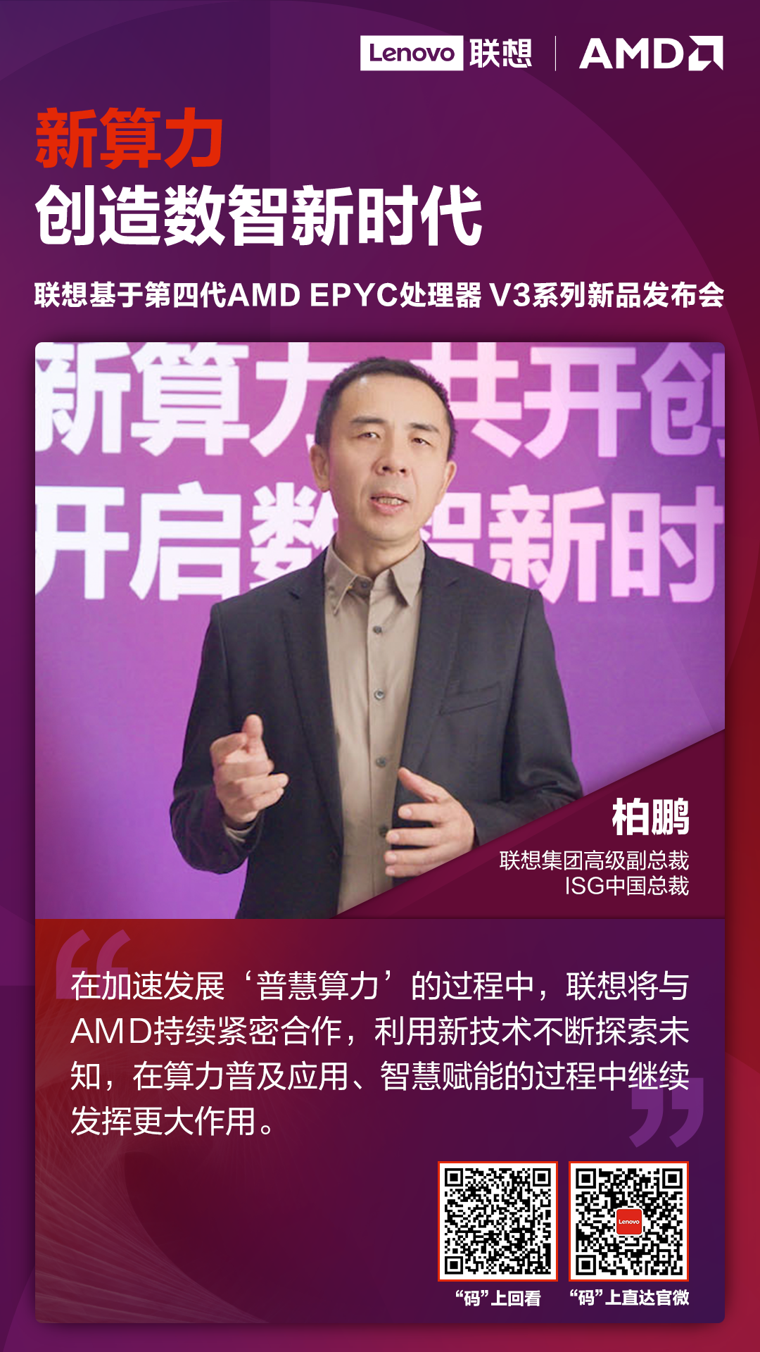 12月15日,联想携手AMD共同举办“新算力 创造数智新时代—联想基于第四代AMD EPYC处理器 V3系列新品发布会”。本次发布会上,联想重磅发布7款基于第四代AMD EPYC处理器的ThinkSystem V3系列服务器新品,双方共同携手助力各行各业加速实现算力的普及与智慧赋能,倡导推进“普慧算力”理念落地。