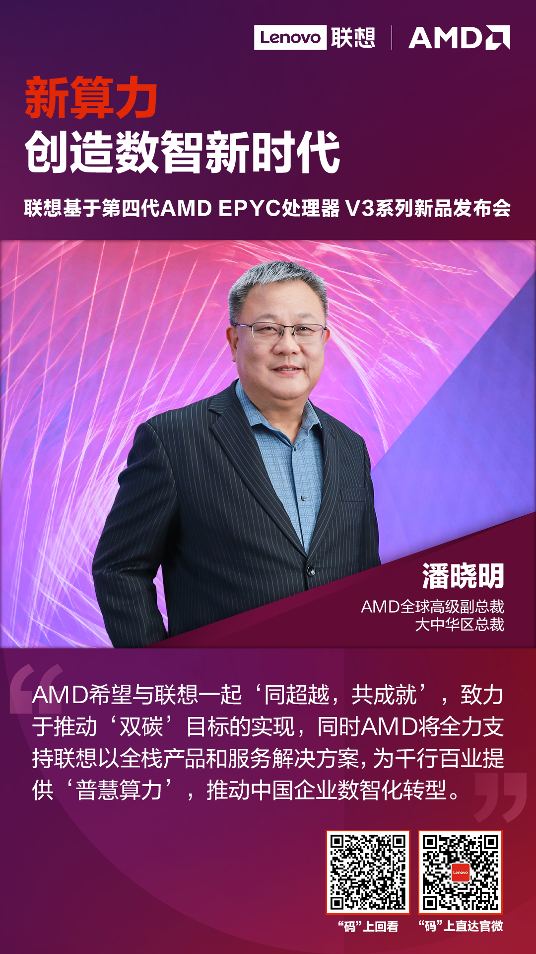 联想是AMD全球战略合作伙伴。一直以来,AMD都在致力于打造伟大的产品,第四代AMD EPYC处理器是我们最新技术的结晶。此次发布的系列服务器新品是双方紧密合作的又一例证。AMD希望与联想一起‘同超越,共成就’,致力于推动‘双碳’目标的实现,同时AMD将全力支持联想以全栈产品和服务解决方案,为千行百业提供‘普慧算力’,推动中国企业数智化转型。