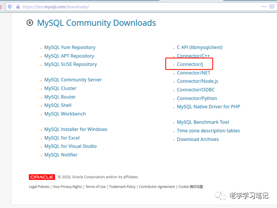 登录MySQL官网下载页面https://dev.mysql.com/downloads/,点击connector/J进入驱动下载页面。