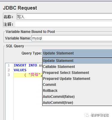 VariableName:选择之前在JDBC Connection Configuration元件中配置好的,这个变量决定这request请求发送命令到那个连接的数据库。