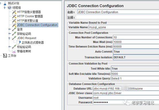 2、在线程组下添加配置元件JDBC Connection Configuration并配置相关参数