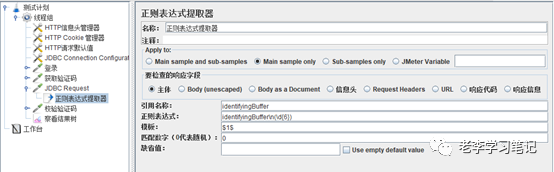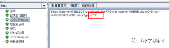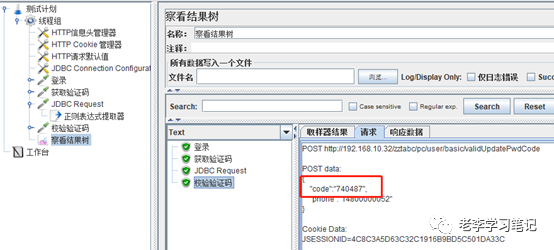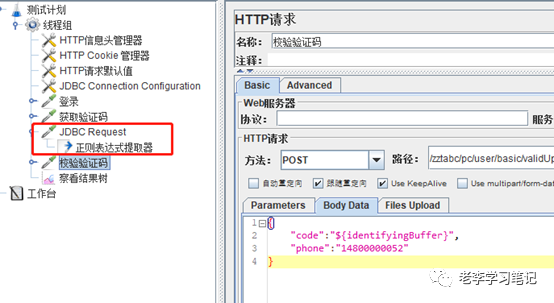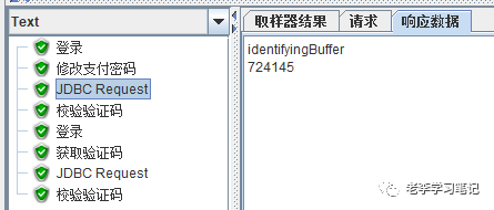 配置完JDBC Connection Configuration后,就可以在需要的位置添加JDBCrequest获取值来配合自动化测试。如下图,在调用获取验证码接口之后,需将验证码作为校验验证码接口的参数传给后端,为了能让接口自动关联,需要我们在获取验证码之后添加一个JDBC request请求数据库取出验证码并返回,然后使用正则表达式提取返回数据中的验证码传入校验接口。