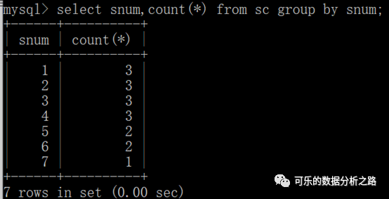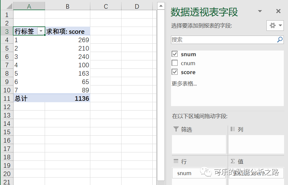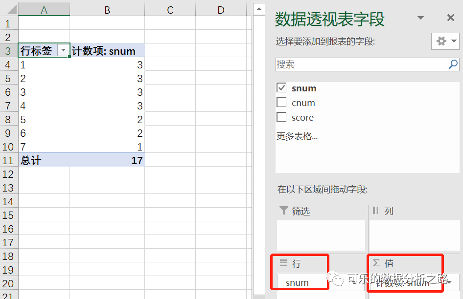 用到【group by + count】,对snum学号一列分组并计数,相当于Excel透视表中把snum拖到列标签,同时对snum计数,结果是一样的。