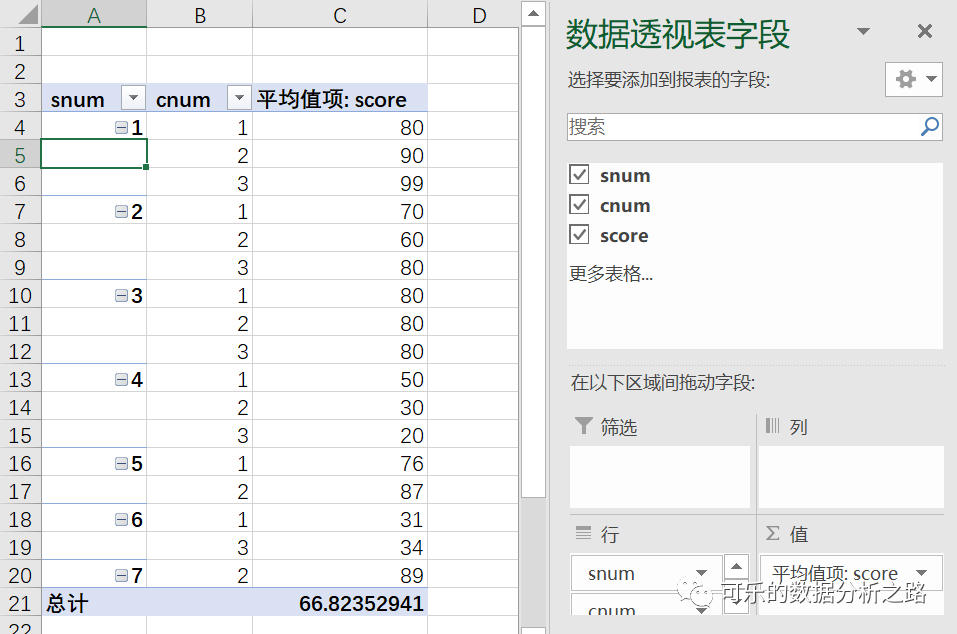 Excel透视表里这样做,把snum和cnum拖动到行标签,score计数项求平均。