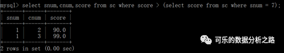 select snum.cnum,score from sc where score > (select score from sc where snum = 7);
