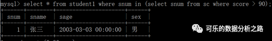 这里提供成绩表(sc)和学生基本信息表(student1),两个表有相同的字段学号(snum),从成绩表中提取成绩大于90的学生的学号,嵌套到基本信息表中。