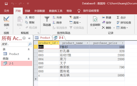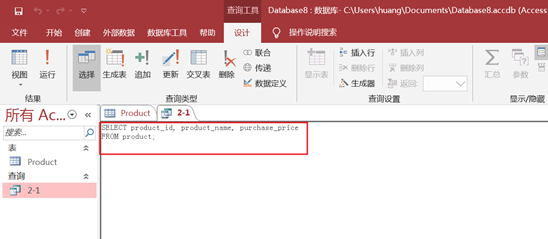 语句意思是从product这个表格中,选取product_id,product_name,purchase_price 这三列,完整输入后,按Ctrl+S保存,可以命名查询为2-1。
