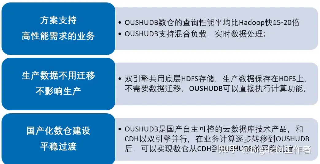 | 过去几年,大多数企业选择了Hadoop技术(大多数选择CDH)建设大数据平台,但是由于Hadoop的分析性能相比MPP差距很大,OUSHUDB融合了MPP和Hadoop的技术,采用存储与计算分离的架构,是一个很好的补充CDH平台分析性能不足的解决方案。本文对CDH和OUSHUDB的双引擎数仓平台方案进行分析介绍。 CDH平台遇到了三大挑战 1. 技术选型的挑战 目前多数客户在建设大数据平台的产品采购或者现有集群扩容时,要求基于国产自主可控的要求; 2. 平台技术局限性的挑战 u 数据处理性能可以满足大多数业务需求,对于性能要求高的业务需求无法满足; u 单个集群处理数据能力有限,需要建立多个集群,且集群间无法共享数据,维护工作量巨大 u 实时性要求越来越高 3. 升级和维护成本高 在Hadoop两大厂商合并以后推出了CDP的升级产品,但是原来基于CDH的所有应用面临重新开发,所以升级成为鸡肋;如果不升级,无法采用hadoop新功能,如果升级,则使应用开发商再次投入开发成本; 基于上述挑战,如何在保持现有CDH投资的基础上,满足业务部门高性能业务的需求? 在CDH平台基础上,引入OUSHUDB数仓产品,可以很好的解决这个问题。 OUSHUDB介绍 OUSHUDB是偶数科技从2016年开始推出,至今已经发展到4.0版本的分析型数仓解决方案。OUSHUDB不仅具备了MPP强大的计算能力,也支持HDFS的扩展能力,如果你的场景解决分布式查询问题,有实时性要求,OUSHUDB也可以符合期望;OUSHUDB主要有下列技术特点: |