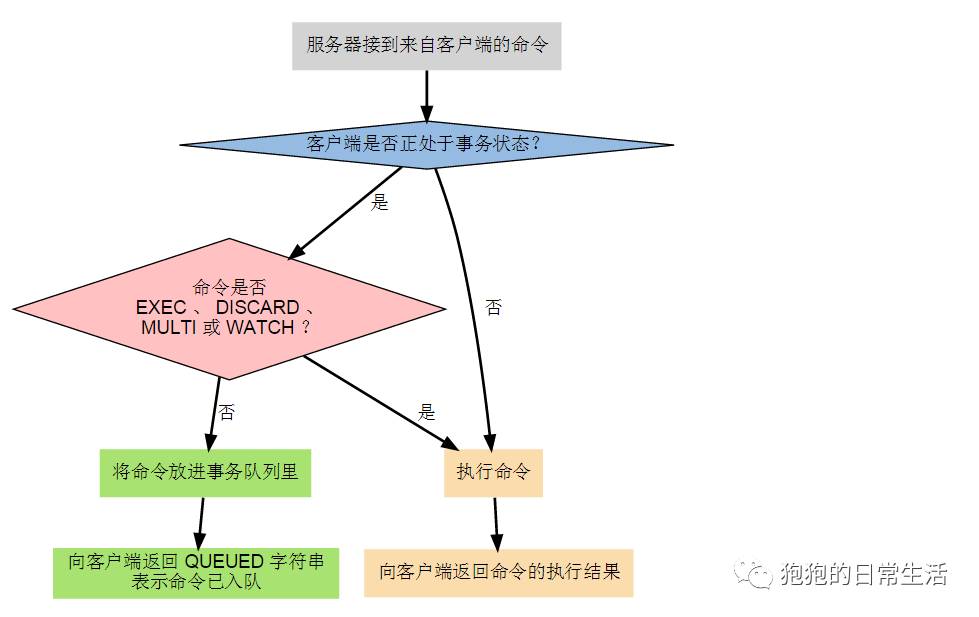 当Redis处理一个请求时, 其实并不是所有的命令都会被放进事务队列, 其中的例外就是 EXEC 、 DISCARD 、 MULTI 和 WATCH 这四个命令 。当这四个命令从客户端发送到服务器 时, 它们会像客户端处于非事务状态一样, 直接被服务器执行。每个Redis客户端都有自己的事物状态,这个事物状态保存在客户端状态的mstate属性里面。