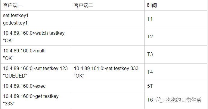 T4时间客户端二修改了testkey值,当T6阶段客户端一执行EXEC命令时,服务器会发现WATCH的键已经被修改,因此服务器拒绝执行客户端A的事物,并返回空。